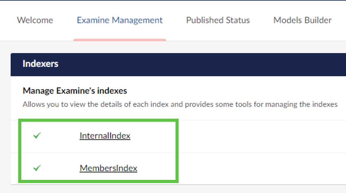 Now, when you restart Umbraco, you will see in the system settings that only two indexes are active, as show in the screenshot below: